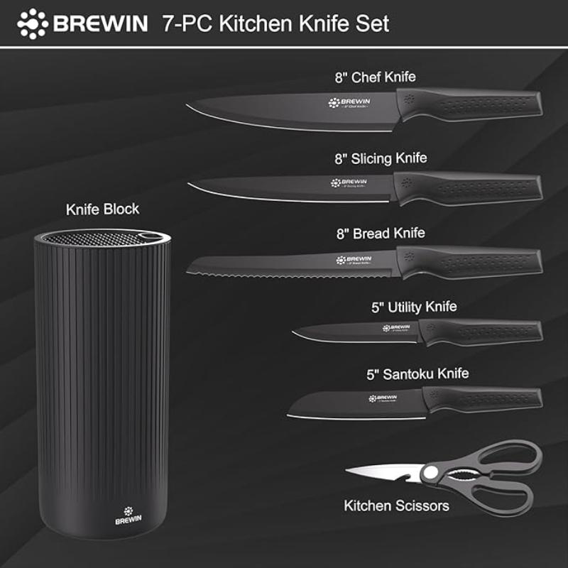 - PERFECT ALL-IN-ONE SET – Brewin kitchen knife set includes 1 x 8” chef knife, 1 x 8” slicing knife, 1 x 8” bread knife, 1 x 5” utility knife, 1 x 5” Santoku knife, 1 x kitchen scissors, 1 x universal knife block. Germain 1.4116 stainless steel. Aesthetic design. Brewin knife set meets all your kitchen works.