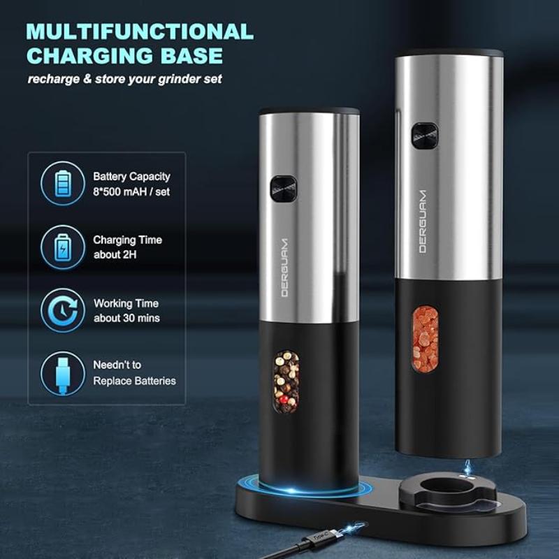 Home Kitchen Tools Rechargeable Electric Salt and Pepper Grinder Set with Charging Base, DERGUAM Stainless Steel Pepper Grinder with Adjustable Coarseness and Led Light