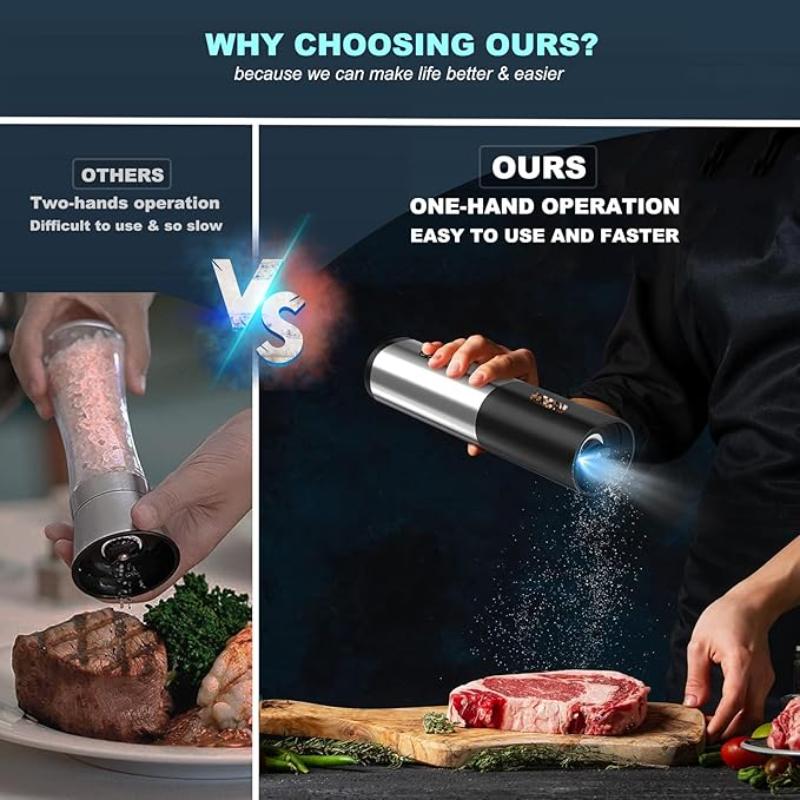 • One Handed Operation Automatic Grinder – With Round square CD pattern design, It’s easy to use with its smart one-hand operation and great for those who have arthritis or chronic hand pain. Just push a button switch for automatic season your food evenly. Better than manual grinder mills. Makes you enjoy the fun of the rechargeable salt and pepper grinder set.